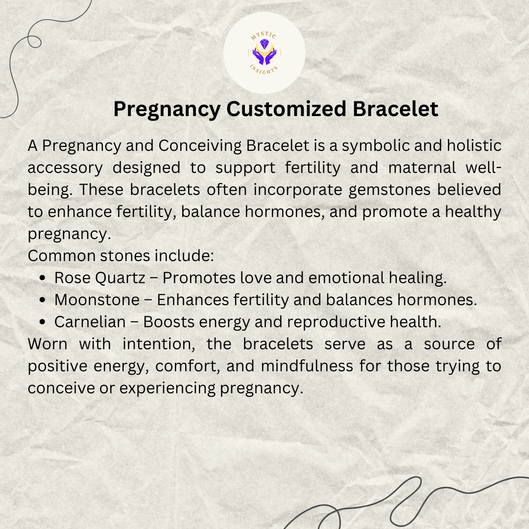 A Pregnancy and Conceiving Bracelet is a symbolic and holistic accessory designed to support fertility and maternal well-being. These bracelets often incorporate gemstones believed to enhance fertility, balance hormones, and promote a healthy pregnancy.