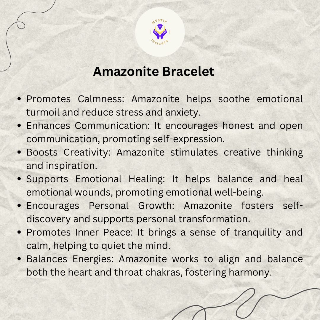 Bring balance and harmony into your life with our Amazonite Bracelet. Known for its soothing blue-green color, amazonite is a powerful stone for calming the mind, promoting communication, and fostering emotional healing. This bracelet helps alleviate stress, enhance creativity, and boost self-expression, making it the perfect accessory for anyone seeking peace and clarity in their daily life.