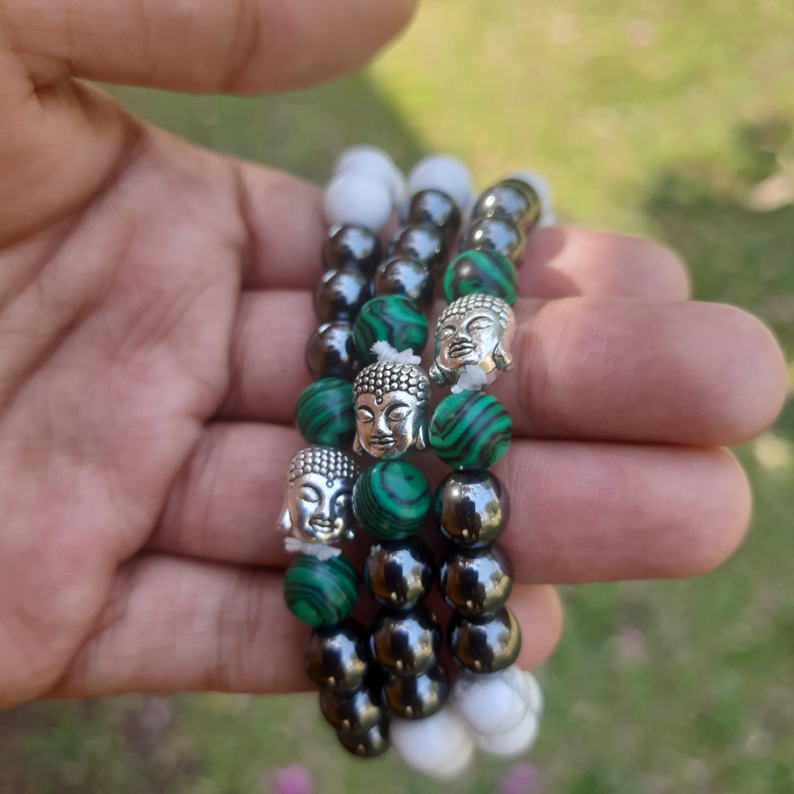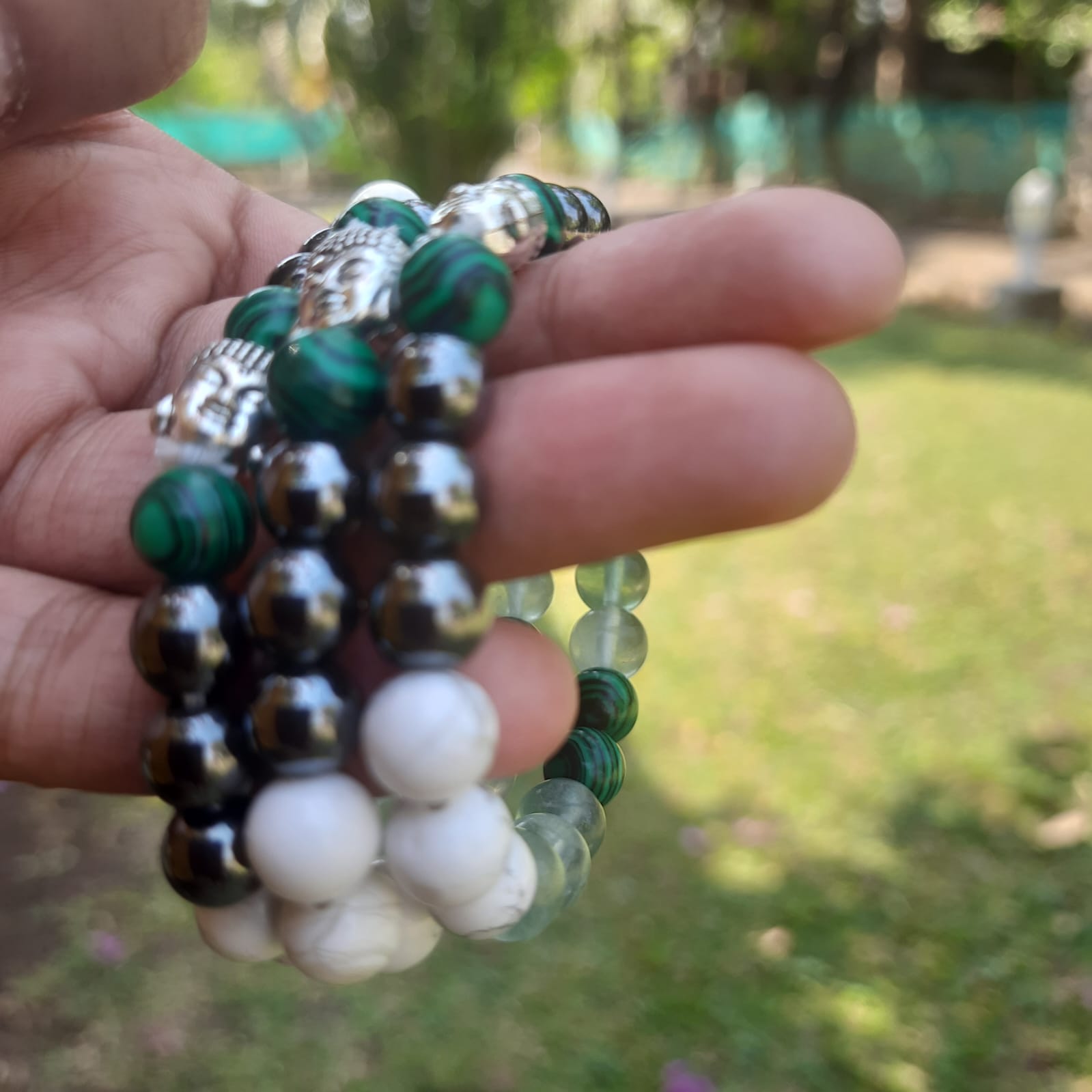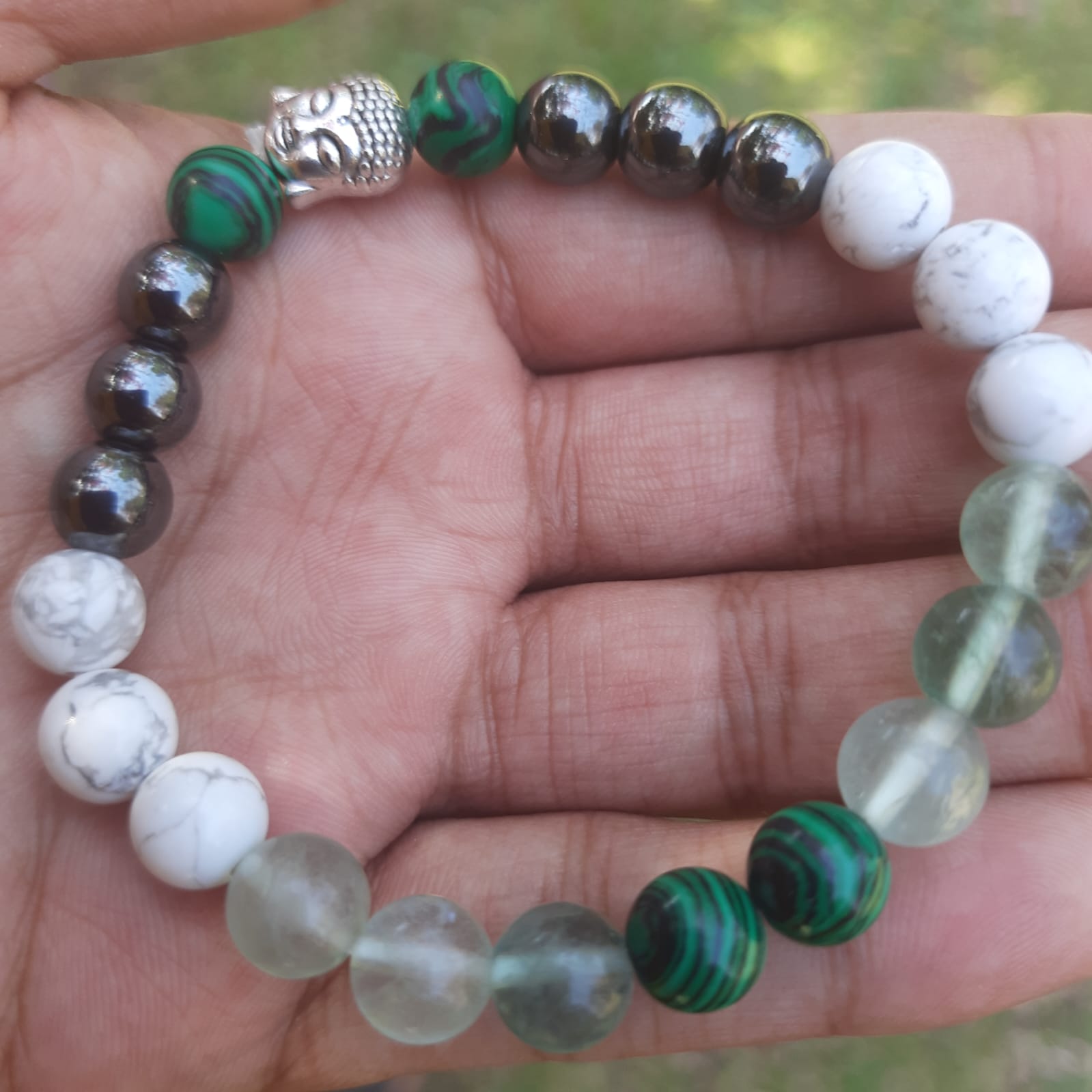 Wear this bracelet with the intention of supporting your bone health. Allow the combined energies of Howlite, Malachite, Fluorite, and Hematite to work in harmony, promoting strength, stability, each aiding in bone regeneration and pain relief.