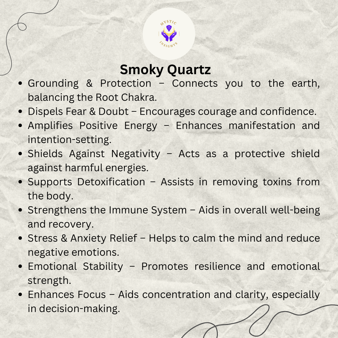 Smoky Quartz is a powerful grounding and protective crystal known for its ability to transform negative energy into positive vibrations. With its translucent brown to deep smoky black hues, this crystal is closely connected to the Root Chakra, providing stability, emotional balance, and strength.